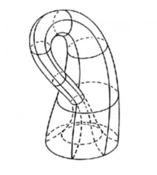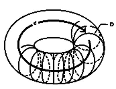 Du tore ensuite, figure introduite dans le séminaire IX L'Identification (1961-62), disons qu’elle incarne les effets comptables de l’Un (un en plus ou un en moins). Cette figure présentifie plus précisément le couple de la demande et du désir. Le paradoxe - aisément observable - est qu'il faille accepter de faire deux tours pour revenir au point de départ et constater enfin l'effectivité d'une perte. J.-D. Nasio le dit très bien dans son livre Les yeux de Laure (1995) : "Le premier tour correspond au tracé d'une répétition locale appelée demande, tandis que le deuxième comprend la série continue de ces répétitions. De ces deux tours résulte le désir. La demande, dans son expression la plus simple, est un message adressé à l'Autre qui revient au sujet sous sa forme inversée, mais sans que le corps en soit affecté ; c'est-à-dire sans que rien ne se détache de la pulsion. Il faut que le premier tour d'une demande retrouve le tour d'une deuxième demande pour qu'il y ait un effet séparation". Il en résulte un trou central, justement, propre à figurer la place de l'objet manquant du désir (l'objet 'a'), qui se révèle mieux dans la figure suivante.