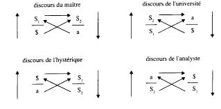 3) La troisième phase de cette topologie des surfaces est celle de la naissance des quatre discours, dans les séminaires XVII et XVIII. La notion de discours est l’occasion d’une nouvelle accentuation de la Lettre qui forme, avec le Trait, l’un des prolongements de la théorie lacanienne du signifiant. Topologiquement, la structuration des quatre discours emprunte au tétraèdre devenu plan projectif, exactement comme le schéma L et ses quatre coins.