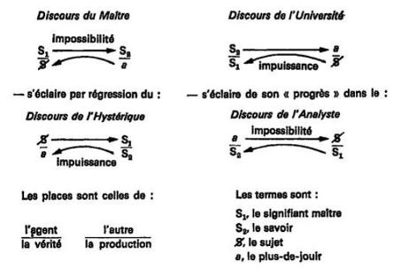 La théorie des discours de Lacan part de la situation énonciative la plus commune où un agent locuteur (destinateur) s'adresse à un autre locuteur (destinataire), ce qui correspond à la forme nucléaire d’un lien social tissé par le langage. Tout message basé sur un code linguistique (S1 > S2, c'est la chaîne signifiante saussurienne) est censé transmettre un signifié ayant valeur de vérité et produire un effet dans le réel. Ces deux derniers éléments appartiennent à l’énonciation, ils sont respectivement moteur et conséquence réelle de la parole, ils n’apparaissent donc pas au niveau conscient de l’énoncé. Ainsi les places sont fixes (agent, autre, vérité, production) et constitutives de tout discours, mais elles se trouvent investies différemment par les sujets en fonction des types de discours, eux-mêmes résultant de situations sociales différentes et de mises en place du désir contradictoires. Ces éléments tournants sont représentatifs de toute subjectivité parlante, ou si l'on veut de toute intersubjectivité pour utiliser un terme que n'affectionnait pas Lacan. Une première parole signifiante (S1) - donc il faut prendre signifiant au sens large d'énoncé, et non de "mot" - est émise en vue (la flèche) d'une réponse potentielle elle-même signifiante (S2). S2 est le second signifiant au sens d'abord où un locuteur s'adresse à une totalité théorique de signifiants, ce réseau de savoir qui constitue l'inconscient où réponse doit pouvoir lui être faite. Le signifié du signifiant premier n'est autre que le sujet parlant lui-même qui s'y représente, donc le sujet en tant que divisé ($) par le manque, le désir, le besoin de parler. D'où la célèbre définition du signifiant par Lacan (il n’y en a pas d’autre qui tienne) : "le signifiant est ce qui représente le sujet pour un autre signifiant". Reste le 4è terme, qui logiquement devrait être le "signifié" propre du S2, sauf que celui-ci n'est plus un énoncé simplement articulé au S1, mais, ainsi qu'on l'a dit, un savoir incluant l'interaction entre les signifiants. Or un savoir n'a pas de signifié comme c'est le cas d'un énoncé S1, nommant lui le sujet, car il faudrait que le savoir rende compte pleinement du réel (de la "Chose") ; mais c'est impossible puisque ce rapport S2/a dépend du premier rapport S1/$. Donc ce qu'il en résulte n'est pas le signifié d'une complétude absolue pour le sujet, une jouissance mythique, mais proprement un reste, la jouissance chue et séparée du sujet que Lacan appelle l'"objet a" ou "plus-de-jouir" pour reprendre l'idée de plus-value de Marx, soit le produit du travail en tant que marchandise chez Marx, et donc produit du discours chez Lacan. Ce n'est pas le moindre des paradoxes que cet objet-effet soit aussi objet-cause dans l'économie du sujet, objet réel cause du désir et donc de l'acte énonciatif. C'est pourquoi les linguistes ignorent ce concept d'objet réel – la linguistique comme discours scientifique ne s'attache qu'aux déterminations et ignore toute autre "cause" - préférant plutôt mettre en avant le contexte ou la situation qui n'engagent pas le sujet dans sa division propre.